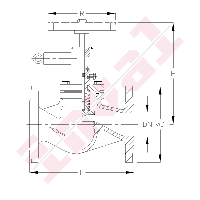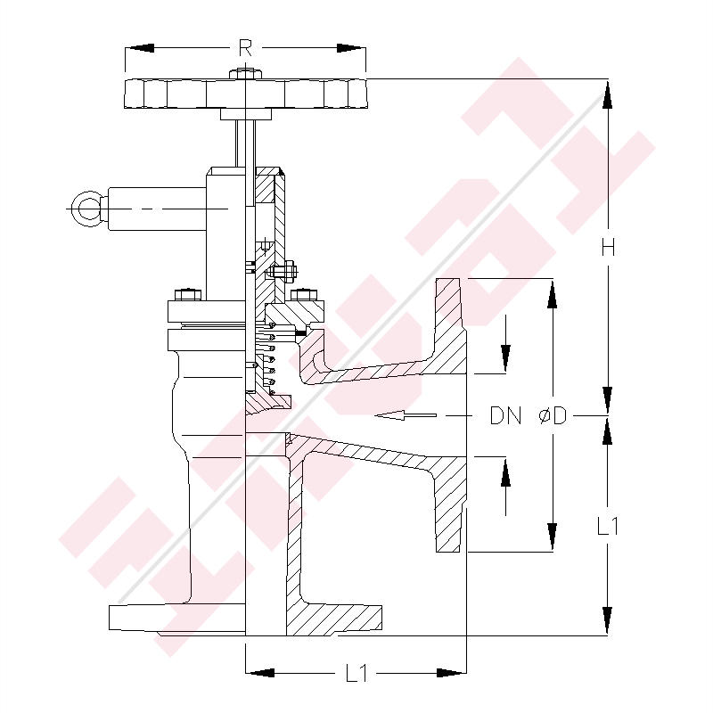PN10 straight quick-closing globe valve, nodular cast iron GGG-40.3 body and bolted bonnet, bronze Rg5 seats, wire operated, flanged PN10, Fig.IN 334.