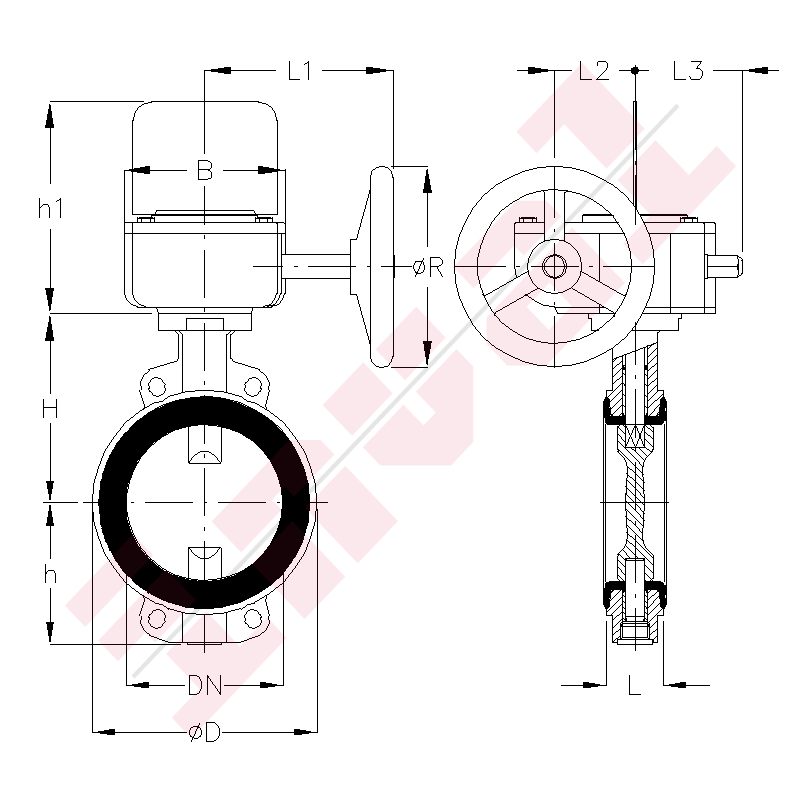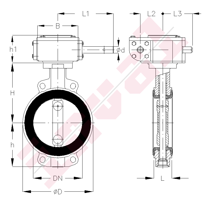 PN10 wafer type butterfly valve, GGG-40 body, AISI 316 disc, vulcanized NBR liner, watertight cast iron gearbox, mounting between flanges PN10, Fig.IN 814NRWW.