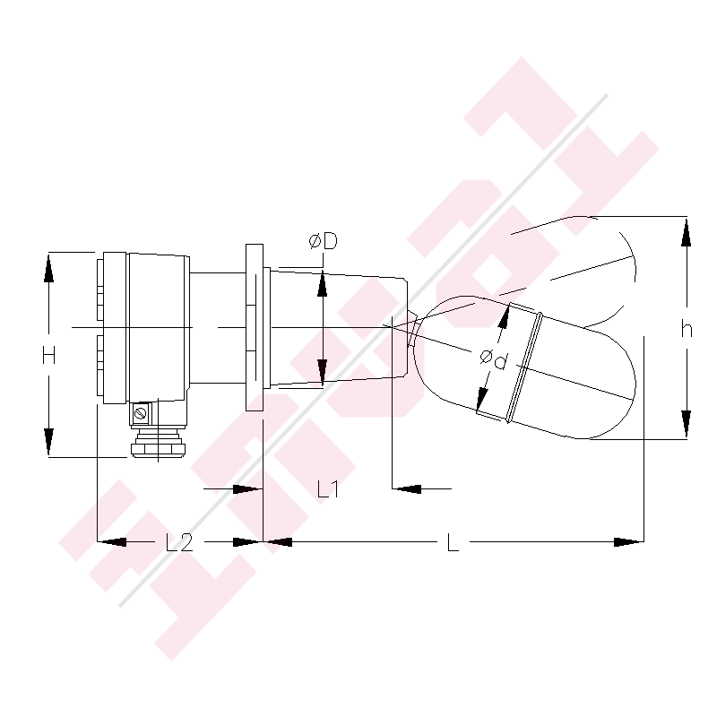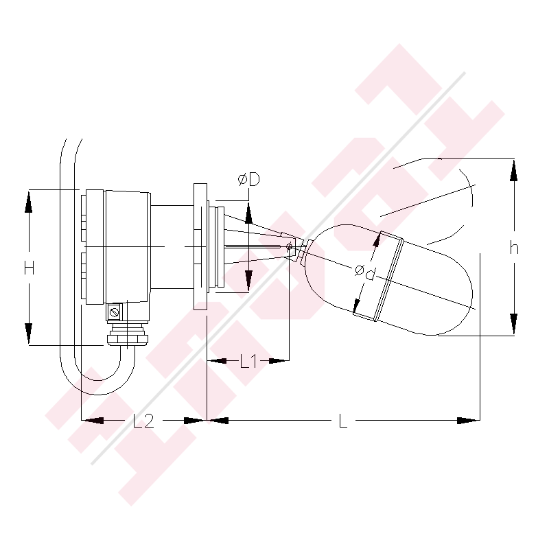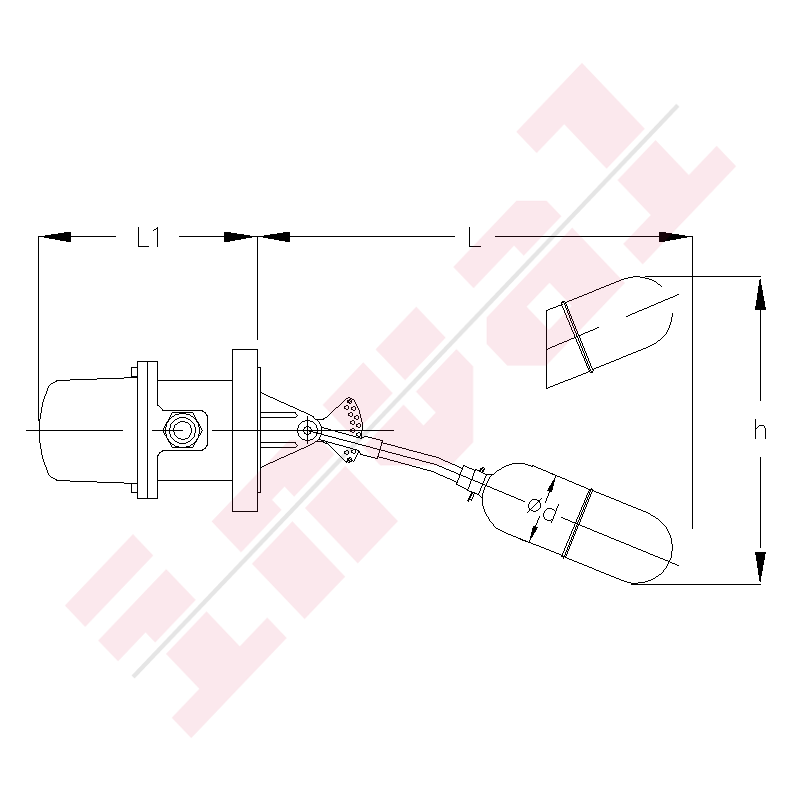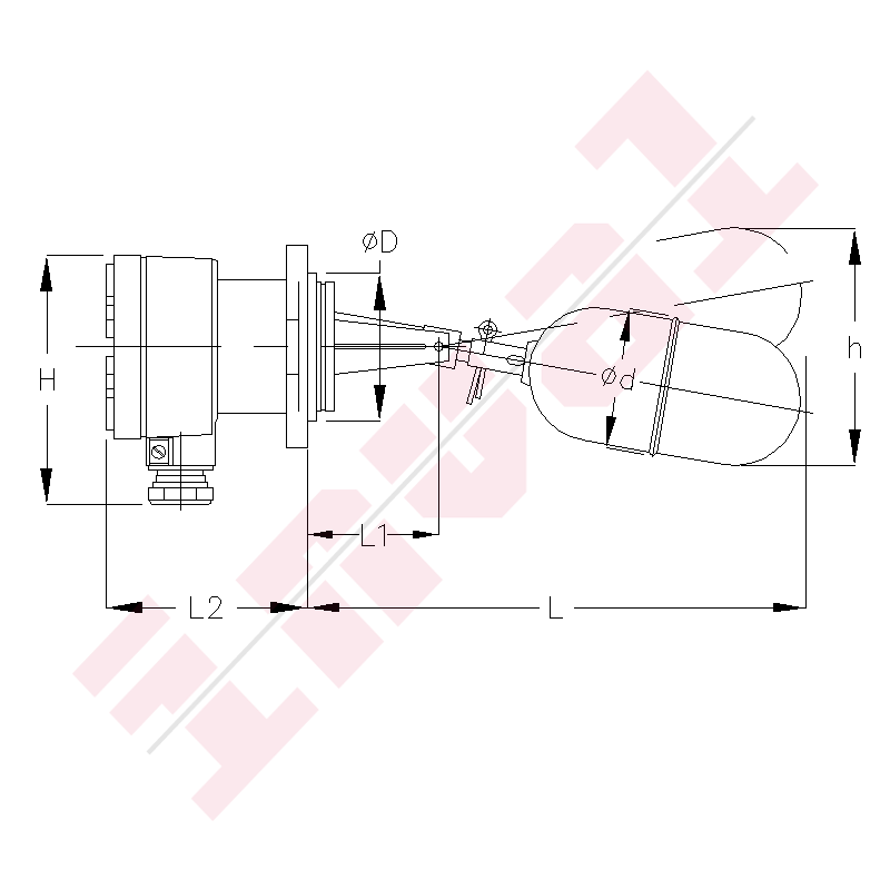 Level switch for horizontal mounting, aluminium body, SPDT contacts, switch differential 20 – 180 mm, AISI 316 float, steel mounting flange 92×92 mm, Fig.IN 1041.