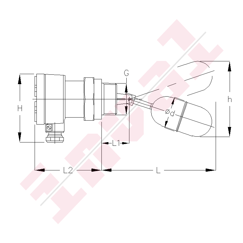 Level switch for horizontal mounting, aluminium body, SPDT contacts, switch differential 10 mm, AISI 316 float, BSP male threaded end, Fig.IN 1040D.