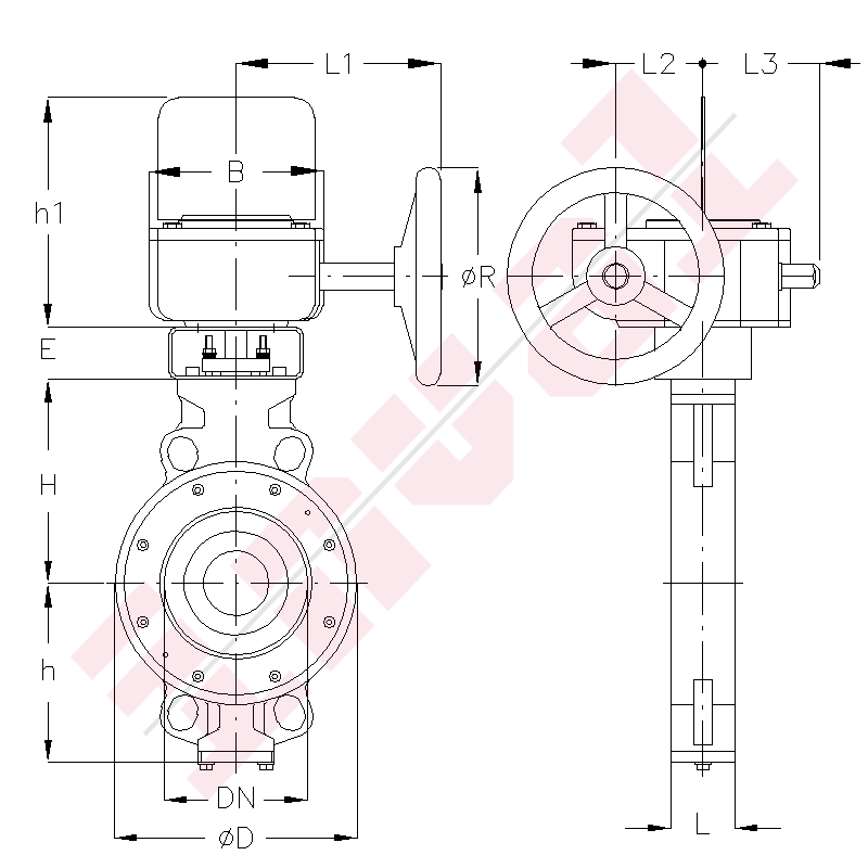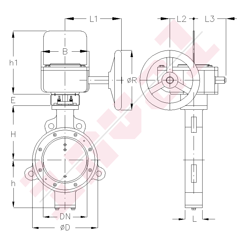 PN10 wafer type butterfly valve, GGG-40 body, AISI 316 double eccentric disc and shaft, PTFE renewable seat, uni-directional, bracket with cast iron gearbox and vane indicator, mounting between flanges PN10, Fig.IN 820N