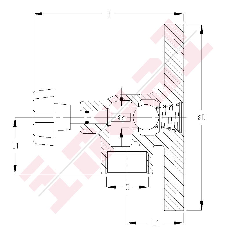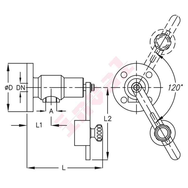 Zelfsluitende stalen aftap afsluiter met hefboom en gewicht, rechts sluitend, integrale zitting, rvs AISI 303 spindel, doorlaat 22 mm, 120° slag dicht/open, inlaatzijde flens PN10, uitlaatzijde BSPP 3/4″ binnendraad.