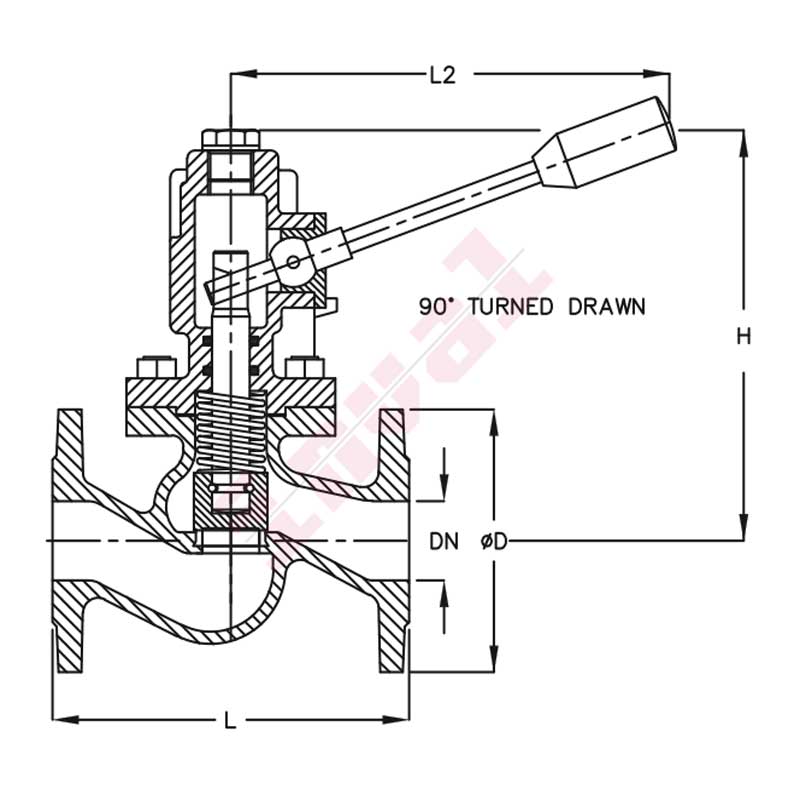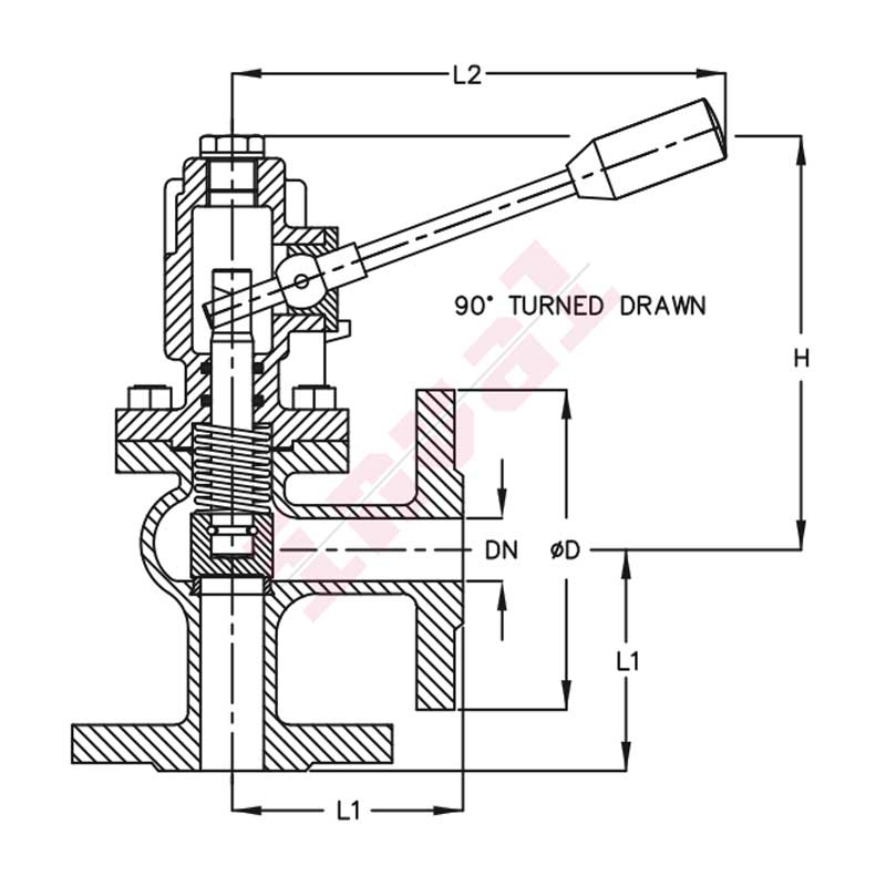 PN10 rechte nodulair gietijzeren GGG-40.3 zelfsluitende klepafsluiter met hefboom, AISI 304 binnenwerk, veersluitend, flenzen PN10, Fig.IN 354.